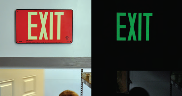 Photoluminescent emergency egress signs absorb and store energy from ambient light (requires 54 LUX or 5-ft candles of fluorescent light to charge material for 60 minutes). In the event of an emergency involving blackout or smoke-laden conditions, the photoluminescent product is immediately visible, providing a safe, illuminated evacuation path. Requiring no power source, photoluminescent products can be installed easily in any location (ambient light source required).